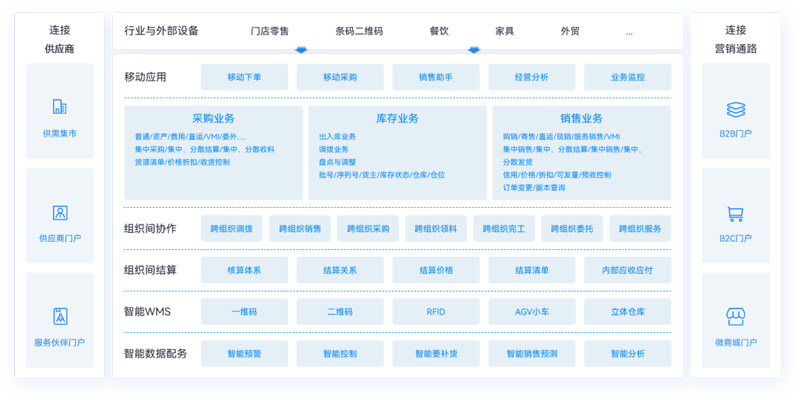 金蝶云·星空整合传统的采购管理、销售管理、仓库管理系统,结合大数据与机器学习技术,为企业提供端到端可配置可组装的数字供应链能力,提升企业协同能力,降低供应链成本,构建企业的敏捷供应链体系。